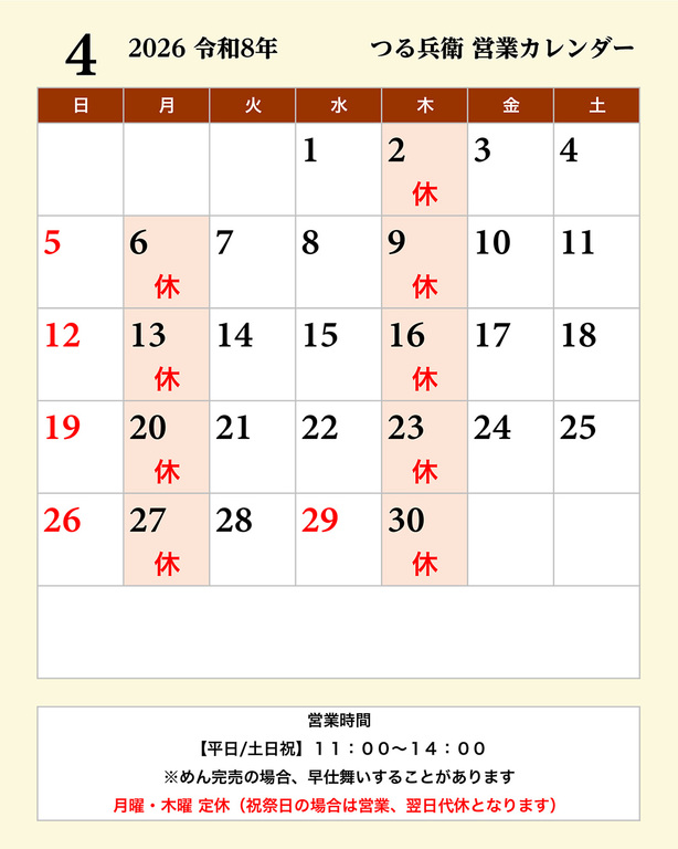 誠に勝手ながら、4月より毎週月曜・木曜を定休日に変更させていただきます